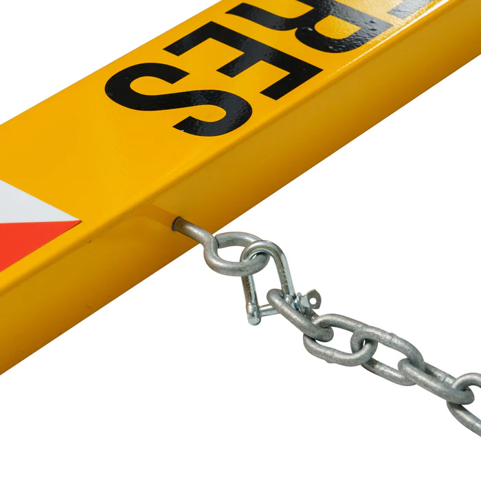Height bars are manufactured from durable steel and has a safety yellow powder coted finish. They come in varies sizes and can be custom made to suit your area. Includes adjustable hanger assemblies with chain. Text is custom applied to suit your requirements. Please specify your maximum clearance height for the text and the length of chain you require.